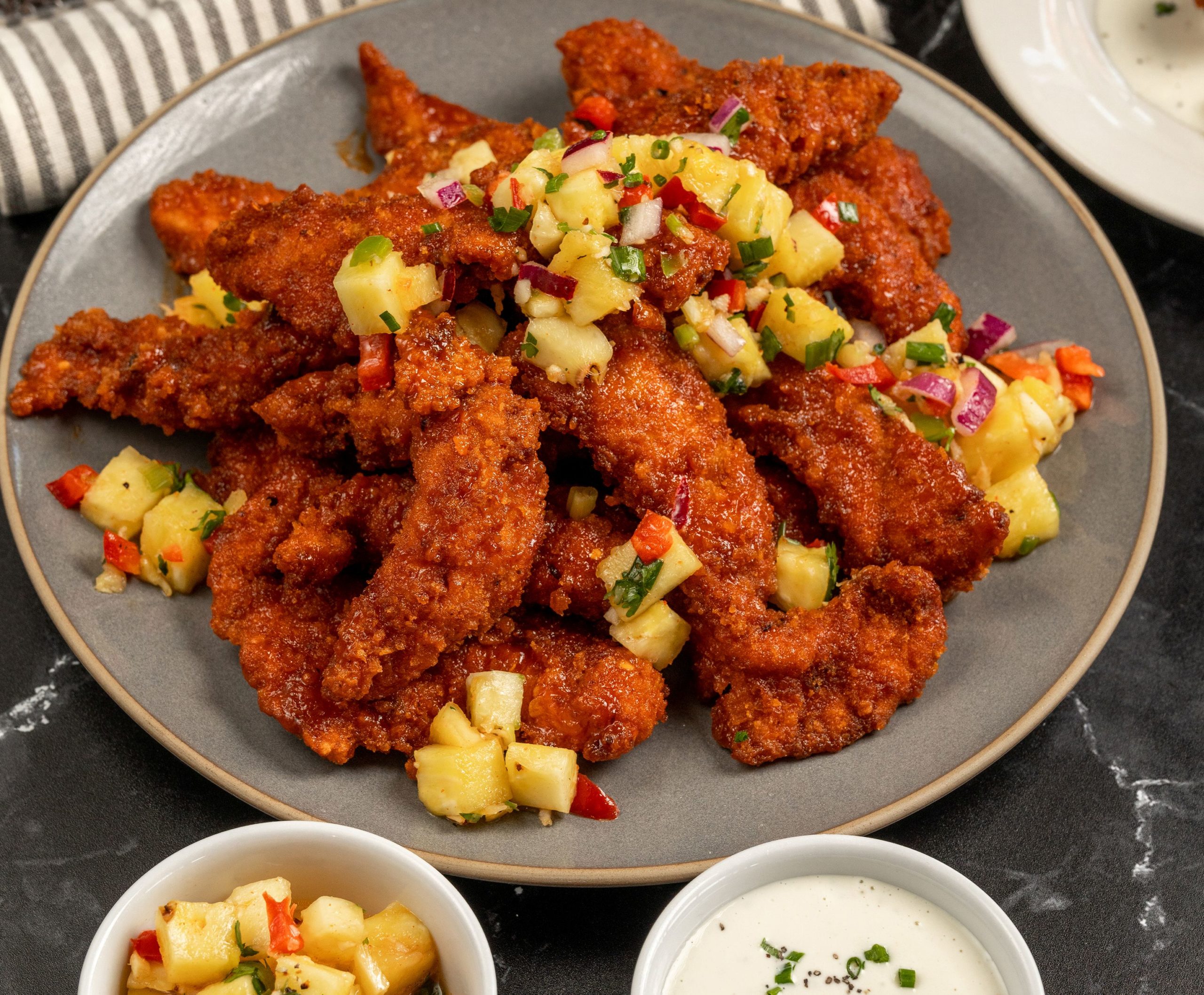 hand-breaded and tossed with our addictive mango-buffalo bbq sauce, with pineapple-jalapeƱo salsa and blue cheese dressing