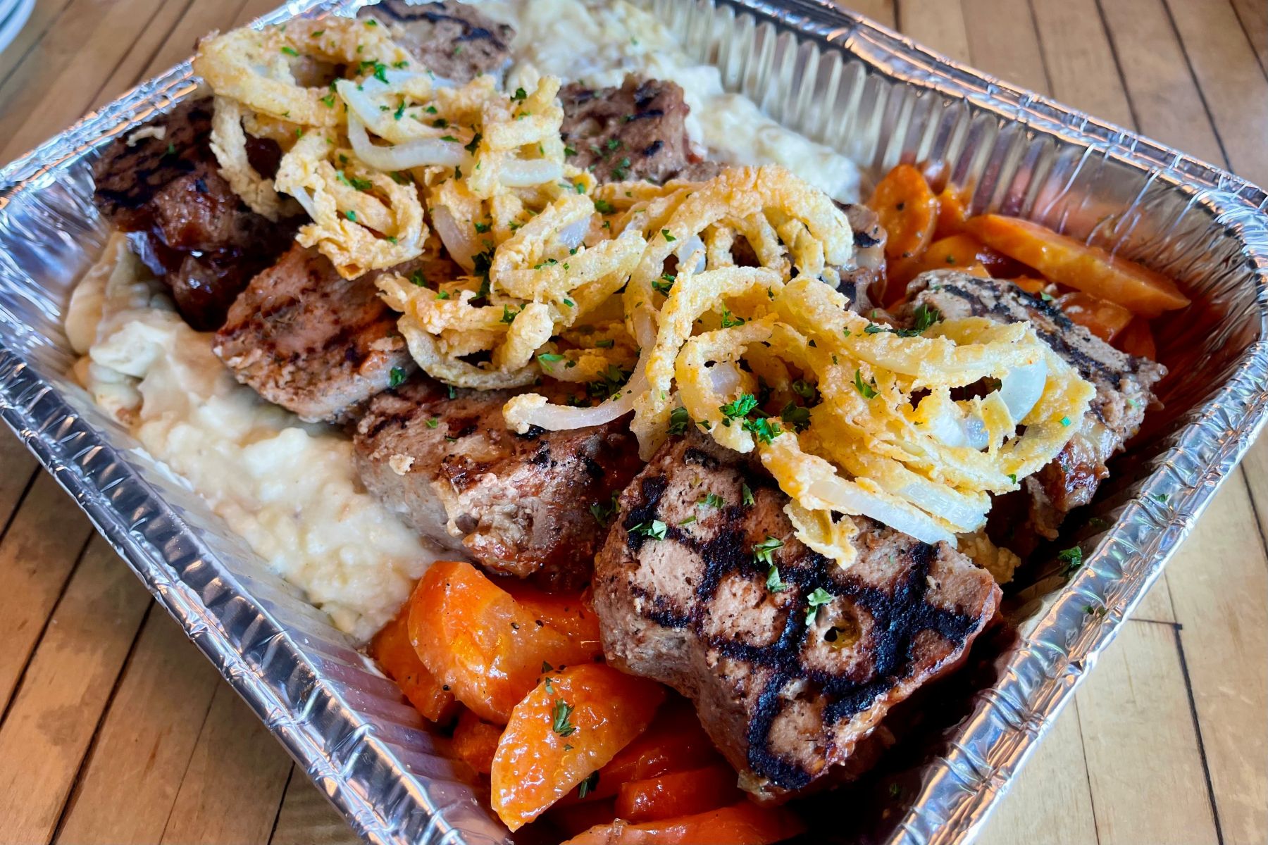 grilled meatloaf made with beef, pork, smoked mozzarella, veggies and herbs, with a tangy bbq gravy, mashed potatoes and glazed carrots, topped with crispy onion strings