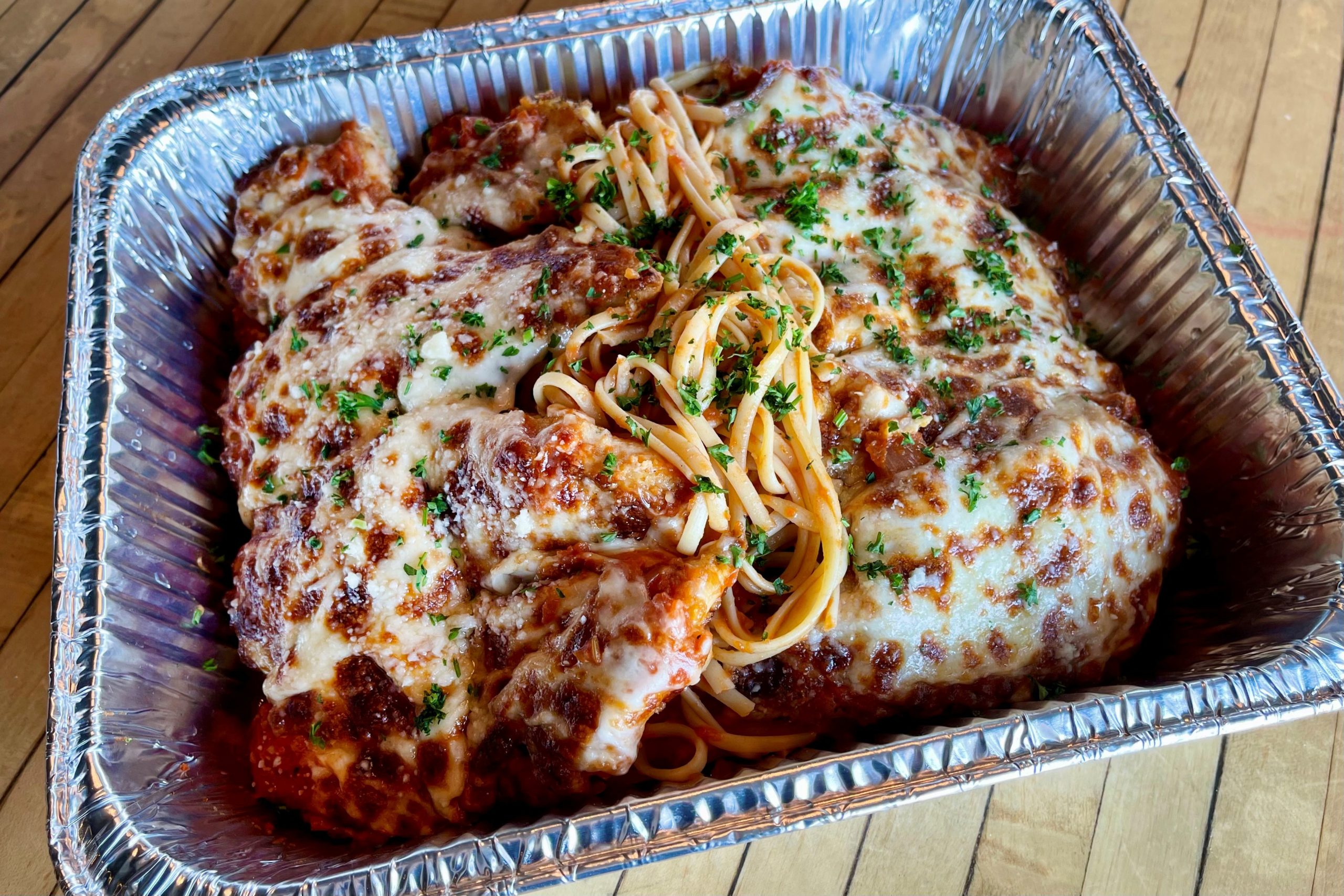 romano-crusted chicken, pan-seared and topped with melted mozzarella over gluten free pasta with house-made tomato sauce