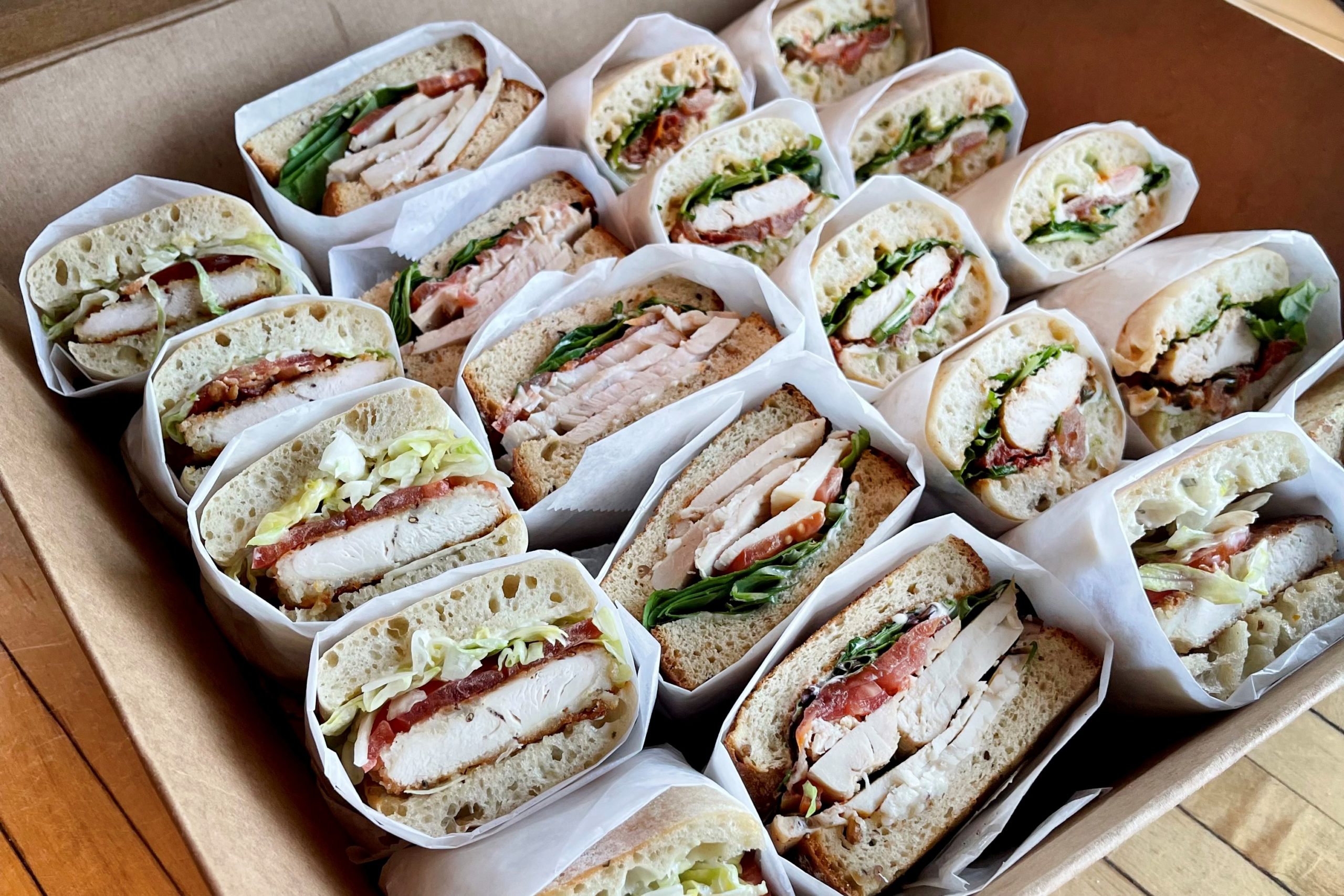 includes 3 Turkey Avocado Club, 3 Mustard Crusted Chicken BLT, 2 Chicken Caprese Sandwich, 2 Veggie Caprese Sandwich