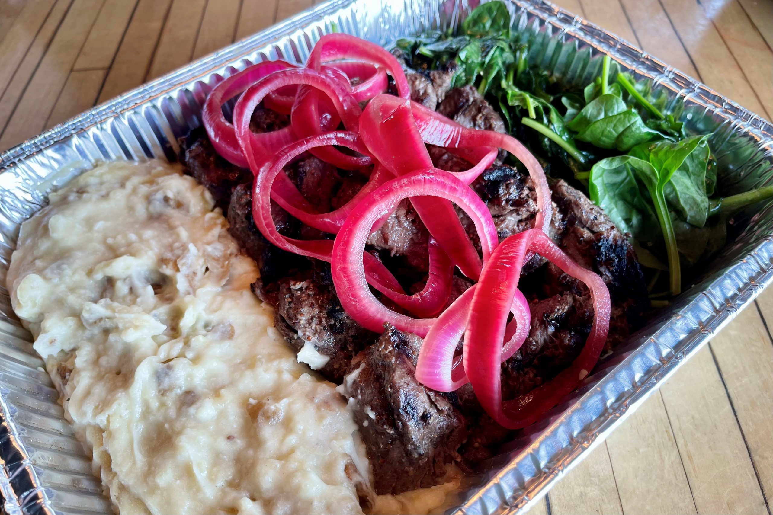 marinated, grilled and served with mashed potatoes, sautéed spinach, pickled red onions and balsamic glaze
